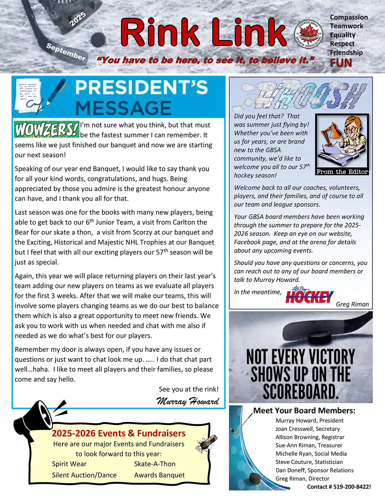 Seven years ago, I was looking for a Knights game on T.V. but instead of finding the game, there was an interview with Murray Howard talking about the George Bray Sports Association. After the interview was over, my wife and I looked at each other, and decided to give Murray a call.