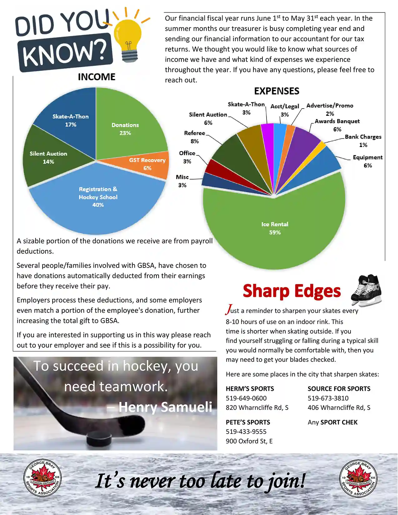 The George Bray Sports Association is a league like no other. I have seen friendships made, confidences soar, fears faced, and some great hockey along the way. From the fundamental program, designed for new players to develop their skills, to league play, with officials, icings, and even offsides, George Bray hockey is unlike any other league. Winning games and scoring goals is secondary to making friends, having fun, letting someone else win a face-off or score their first goal. I have seen a lot of hockey over the years, but I have never seen a league quite as welcoming, as warm, and as wonderful, as the George Bray Sports Association.